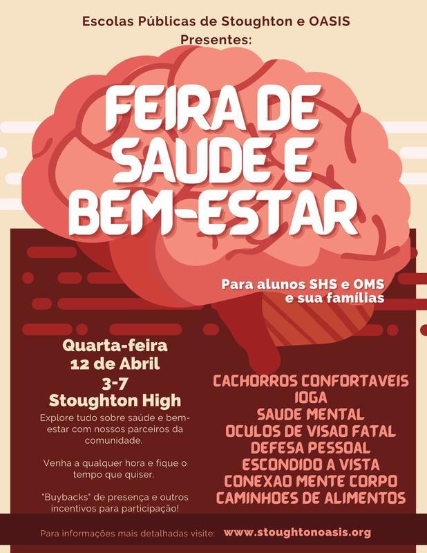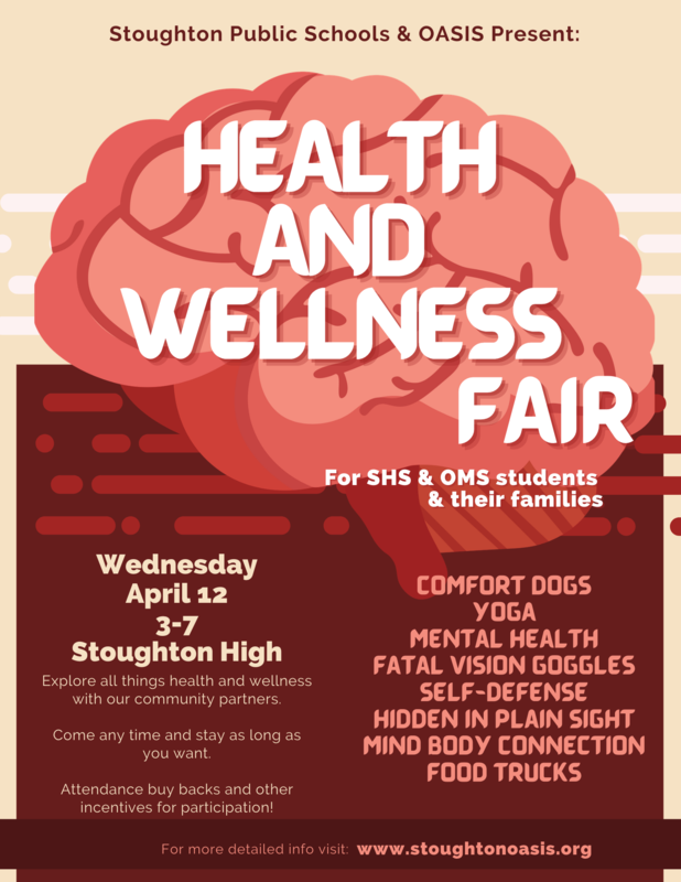 The Stoughton Public Schools is partnering with OASIS to hold a Health and Wellness Fair for Stoughton High School and O'Donnell Middle School students and families. The fair will take place on Wednesday, April 12 from 3-7pm at Stoughton High. Check out the flyer below for more details: