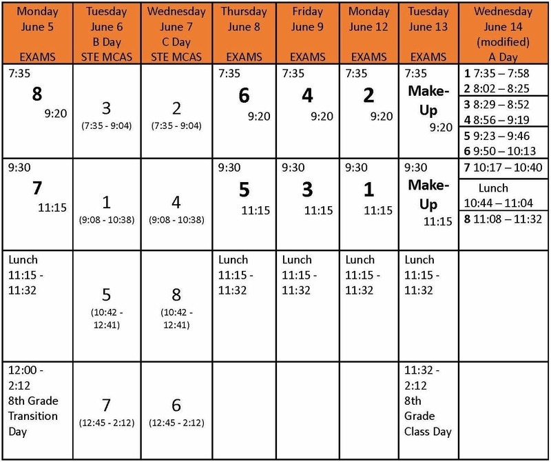 - Tuesday, June 6th, and Wednesday, June 7th, will follow a regular B day and C day bell schedule. Students in Grades 9 and 10 who are in Biology will be taking the MCAS on these days. All other students will report to their normally scheduled classes.