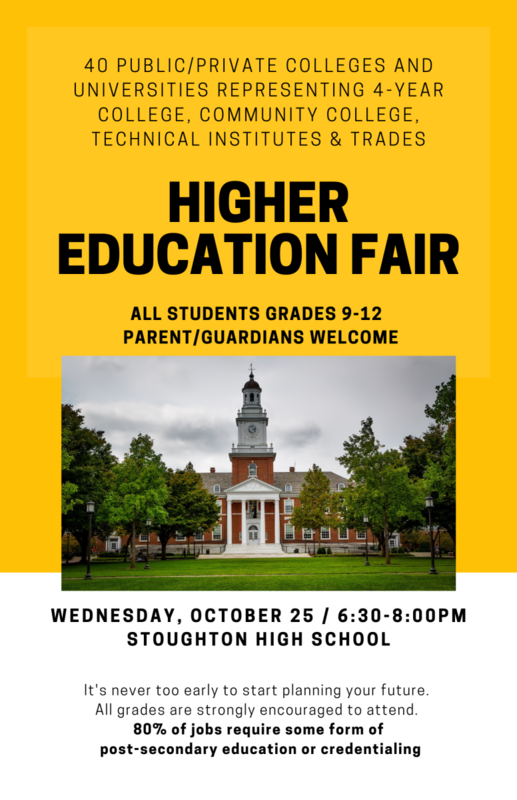 Stoughton High School College and Career Center invites all students grades 9-12 and their parents/guardians to an evening Higher Education/College Fair on Wednesday, October 25 from 6:30-8:00pm.
